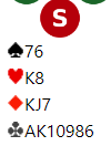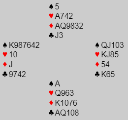 Slik det sitter vinnes 6 ruter. Det går også an å vinne 6 hjerter ved å løse hjerteren med en taper siden syd har hjerter 9. Vests tier faller, og østs hjerterbeholding blir sittende i mellom og gir kun ett stikk.