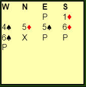 I 6 spar doblet ble det fem bet, N/S +1100. I teorien er det en god stamp, N/S ville jo fått +1370 i ruterslemmen de hadde vært i like før. Men det er ikke alltid teorien stemmer med praksis, og selv om det var en god stamp - det beste Ø/V kunne gjøre idet N/S var i 6 ruter - ble det tapt spill for lag HAUGE.