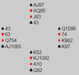 Nord åpner med 1 kløver og syd sier 1 hjerter, naturlig. Nord høyner til 2 hjerter før syd går i 4 hjerter. Utspill?