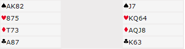 Ruter 10 vinner stikket. Du fortsetter med ruter til knekten som også holder. Påkastene i de to ruterrundene tyder på at ruteren satt 3-3 fra start, men du kan selvsagt ikke stole helt på det. Nå er det vel tid for å jobbe med hjerteren. A-Q i ruter kan det ventes litt med. Spar til bordet og hjerter 8 for å se om det dekkes, det er interessante mellomkort i hjerter også. Og på hjerter 8 fra vest smeller nord i hjerter knekt. Du bruker kongen og syd stikker med esset. Derfra kommer nok en kløver til kongen. Det viste seg i det stikket at syd hadde startet med kun fire kløver, nord tre kløver.
