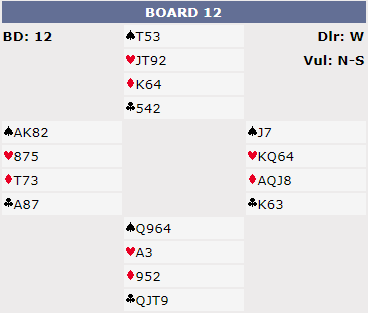 Ved samtlige bord var kontrakten 3NT. Ni stikk ga hårfint over middels til Ø/V, for tre par gikk bet i 3NT.
