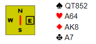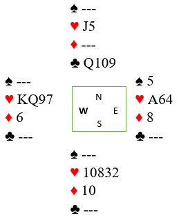 Som du ser kan spillefører ta fire stikk i hjerter for egen maskin, med kongen først, liten til esset som tar med seg nords knekt, så en finesse med vests nier. Da blir det kun den ene taperen i trumf..