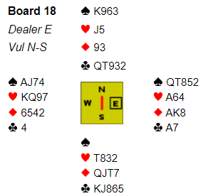 Dette er på grensen, og mange oppvurderte kortene til 18 og åpnet med 1 spar i den hensikt å vise 18-19 grand neste gang. Merkelig nok ble det lettere å finne toppkontrakten for dem som de som åpnet med 1 spar som i første omgang viste kun åpning, 11-12+ poeng.