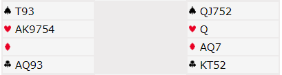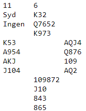 Her er et spill fra en turnering forleden hvor det først og fremst handlet om å ha systemet i orden. Dernest var det litt forskjellige muligheter med hensyn til å få fatt i de stikkene som var tilgjengelige.