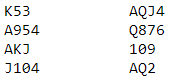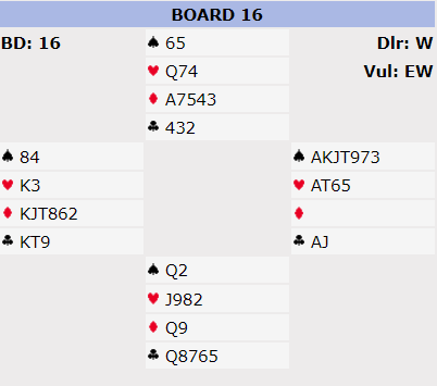 N/S var et bra par som kom i premierekken i denne turneringen, men de sovnet av mot slutten av dette spillet. På kløver 10 kastet syd spar 6 og ble sittende med singel spar konge. Hadde det vært spar ess måtte han ha kastet det for ikke å bli innspilt. Så kom spar dame fra øst til syds single konge. Nå burde nord stukket over og spilt ruter. Men han hadde mistet tellingen og la liten sånn at stakkars syd fikk være inne med to kort igjen. Ruter til saksen fra syd ga øst de to siste stikkene for A-Q, tolv stikk.