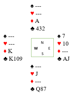 Vel, slik det sitter blir det faktisk tretten stikk om spillefører av en eller anne grunn tar kun en hjerterstjeling også. La oss si han gjør det før han setter i gang med trumfene (og ikke tar finessen). Da står resten utenom hjerter 10. Mot slutten får syd pustebesvær, og før den siste trumfen vil det i så fall se slik ut: