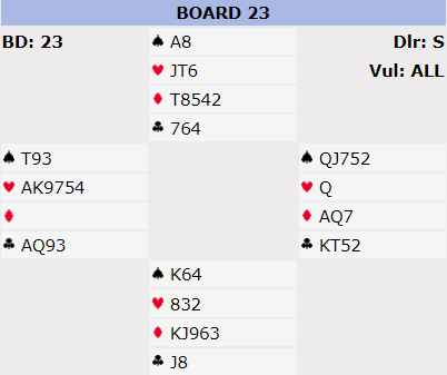 Kun 15% af Ø/V-parene meldte 6 spar. Alle slemmelderne vant den, og alle unntatt en av dem fikk tretten stikk. Det ga middels å vinne +710 for tretten stikk i 4 spar da noen fikk kun tolv stikk i utgang, og som alltid var det enkelte som hadde rotet det til i meldingene og havnet i rare kontrakter etter misforståelser, samt at ett par var i delkontrakt (!).