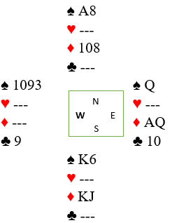 Syd spilte ut hjerter til østs dame mot 6NT. Spillefører går over på kløver dame og tar hjerterstikkene, fargen satt behagelig 3-3. Hos øst holdes singel spar dame og AQ i ruter foruten tre kløver. Så tas de tre siste kløverstikkene, og før den siste kløveren ser det slik ut: