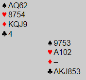 Du satser på at makker finner motspillet og ikke nødvendigvis har knekten i hjerter, og spiller derfor hjerter ess. Makker legger styrke, og du fortsetter med hjerter. Men hvilken hjerter?