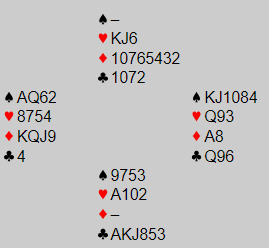 Liten hjerter i skift i andre stikk ville fungert. Da vinner nord med kongen og spiller hjerter tilbake. N/S tar tre hjerterstikk og beter 4 spar selv uten ruter til stjeling.