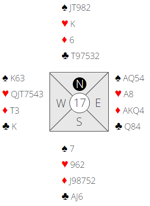 Det mangler to nøkkelkort (trumf konge og kløver ess), så de stopper i 5 hjerter. Men denne gangen står slem fordi hjerterfargen er uten taper, men det er likefult teoretisk korrekt bridge å stoppe i utgang. Trumfkongen må sitte hos nord, og den må dessuten være singel eller dobbel (kongen tredje gir stikk), så det gir under 50% sjanse for slem. I praksis er dog sjansen for å vinne slem være litt større sjanse, for om forsvaret ikke får med seg sitt ess kan slem fyke hjem selv om det egentlig er to tapere. Her vil det være vanskelig for syd å ta for kløver ess mot 5 hjerter. Mot slem er essutspill mer vanlig, og han ville nok helt sikkert tatt det om han hadde hatt hjerter konge også og motparten var i slem.