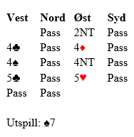 At 5 ruter er en mulig sluttkontrakt ble nevnt, og det er kanskje en mer naturlig kontrakt å komme i enn 4 spar. Det er ikke så lett for syd å passe på 4 spar selv om nord får foreslått det i meldingsforløpet som kan gå på forskjellige måter, alt etter om øst sperrer eller bare melder inn, og hvor høyt han sperrer hvis han velger det.