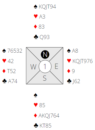 Idet vest inviterer til slem har øst fine kort til å akseptere sleminvitten, og det gjør hun med 4 ruter, eller man kan si 4NT Key Card direkte med helt perfekte kort for hjerterslem. Ø/V får undersøkt slemmulighetene.