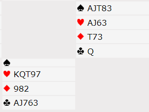 Jeg må fyke opp med hjerter ess og spille spar. Da tar vi fire sparstikk når makker har den magiske kombinasjonen K-9-x så spar til kongen og nieren tilbake fisker effektivt opp nords beholdning.
