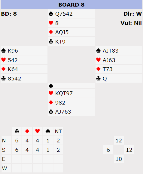 Den mest vanlige kontrakten rundt omkring var delkontrakt i ruter. Som du ser av analysen kan det vinnes hele tolv stikk i kløver, men det forutsetter meget god spilleføring etter spar ut hvor syd blir kortet i trumf. Så å sitte imot 3NTmed ni stikk ble selvsagt ikke jeg og makker rike av.