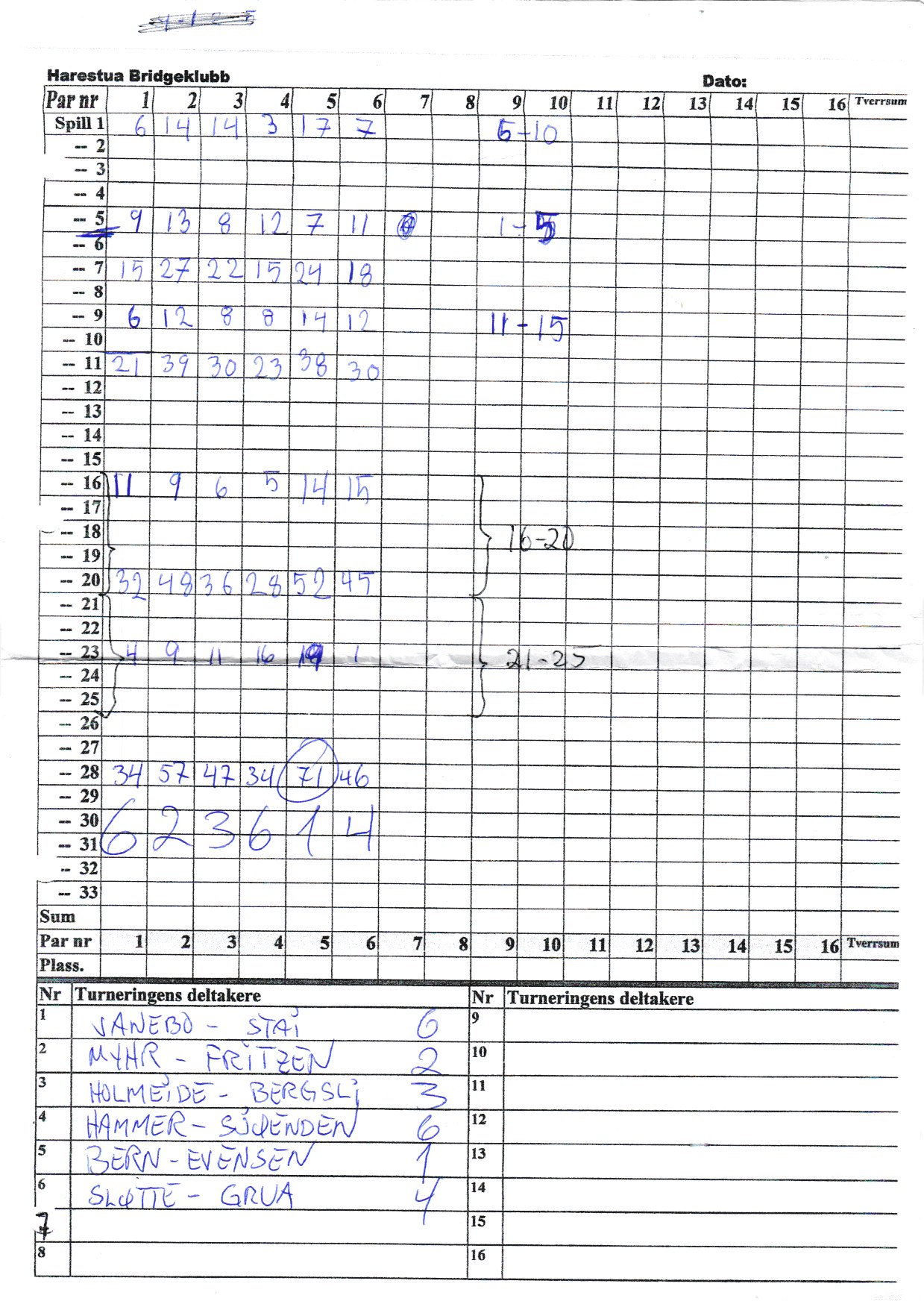 Sarpsborg BK 12/1, 1. av 3- kvelds, 16 par, M= 0