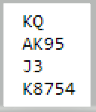 Der passet både øst og syd, og meldingene gikk ganske normalt selv om ikke alle ville meldt inn 1NT med nords kort. Fordelen med 1NT selv med singel kløver dame er at styrken fortelles med det samme i motsetning om en velger innmeldingen 2 ruter. Ulempen med 1NT er at man kanskje ikke finner hjerterkontrakt hvis syd har svake kort og ikke kan melde over 1NT. Å doble opplysende er en mulighet, men det blir litt klønete det og hvis makkeren melder kløver (kan dog ta ut i ruter i så fall).