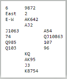 Syd var Rodrigo Garcia da Rosa, proffspiller fra Uruguay, og han hadde vel noe som lignet mer på en hånd egnet for åpningen 3 kløver enn østs kort. Men det ble ingen hyggelig kontrakt å spille. Han fikk tak i to sparstikk, ett ruterstikk, stikk for kløver ess og knekt samt en hjerterstjeling med liten trumf. Det ble seks stikk, tre doblede bet, ASHTON +500.