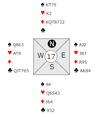Men nord hadde ikke til 3 ruter, han var for sterk til det. Så nord åpnet med 1 ruter, og da er innmeldingen 1NT opplagt. I så fall vil vest undersøke litt da hans kort tilsier annen kontrakt enn grand. Men det blir ikke fred å gå, nord melder mer: