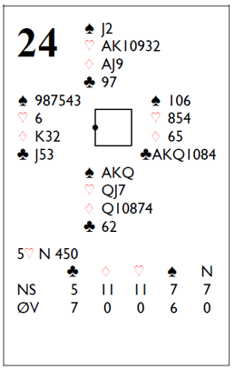 Over halvparten av N/S-parene fant frem til 4 hjerter. De aller fleste av dem fikk elleve stikk og fikk for det et pent pluss-spill. Toppen gikk imidlertid til et par som spilte 3NT som N/S og fikk elleve stikk, +460. En morsom topp, men selvsagt er det feil kontrakt da Ø/V kan ta seks kløverstikk på direkten. Så det må være lov å si det er flaks, men flaks er det lov å ha i bridge! Og det var syd som spilte 3NT. Hvis nord hadde vært spillefører i grandkontrakt ville nok øst funnet kløverutspillet. Siden vest ikke spilte kløver ut er det grunn til å tro at øst ikke hadde meldt fargen. Nyttig lærdom, for sånne farger bør man si fra om!