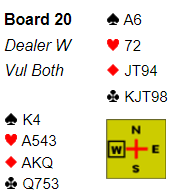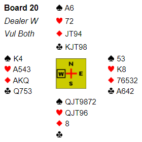 Denne storeslemmen kan selvsagt gå bet, men det må kløver ut. Da kan de få tak i to bet i 7 hjerter, ett kløverstikk samt en ruter til stjeling. Det ville likevel gitt kun +500 til Ø/V, småtteri mot +2210 til Ø/V ved det andre bordet. Men det skulle bli verre for dem som lot N/S spille 7 hjerter doblet, for øst valgte å spille ut spar. Spillefører stjal, tok ut trumfen og satt opp ruterfargen med en stjeling. Dermed ble det vunnet storeslem ved det bordet også, men der altså til N/S som noterte seg for +1770. Den søte dobbelscoren +3980 ga uvanlige 23 IMP på ett spill.