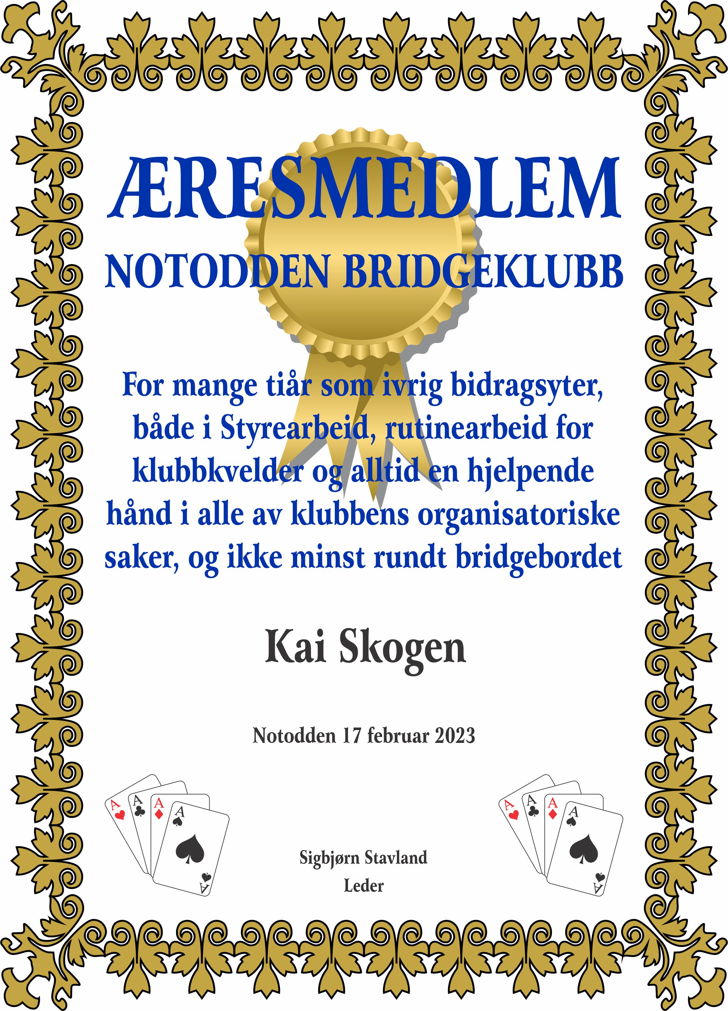 I forrige nyhet kan du lese årsberetningen og referatet fra det møtet. Vi må fremheve at det ble en spesiell og overaskende nyhet. Etter 25 år med ansvar for kiosken, der han kommer en time før spilling og reiser en halvtime etter å ha ryddet, samt alltid positiv engasjement og har stort pågangsmot, var det en rørende stund da Kai Skogen ble tildelt Æresmedlemskap i Notodden Bridgeklubb. Det ble en lang stående applaus for den fortjente tildelingen. GRATULERER KAI