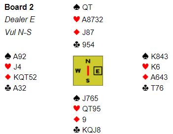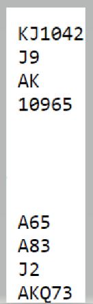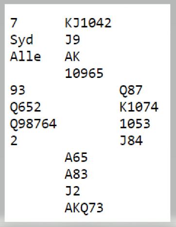 (Jeg tar fordbehold om at det kan hende det var tieren som ble spilt og at det var vu-graph operatøren på BBO som klikket hjerter 9 i stedet for hjerter 10)