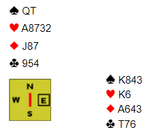 Så dette er ikke noen lett avgjørelse for nord i andre stikk. Han stakk imidlertid med esset med fare for å ødelegge N/S sin overgang i fargen ved hjelp av en mulig tredje hjerter hos syd. Men slik så hele spillet ut: