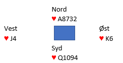 Er det slik blir det veldig galt å legge liten fra nord i andre stikk! Da har N/S fem hjerterstikk direkte hvis nord stikker med esset nå, siden spillefører bommet valget i stikk 1. Syd har i så fall spilt nieren tilbake for å avblokkere, for om han spiller etter opplegget med fordeling fra gjenværende, hjerter 5 i andre stikk vil fargen blokkeres og nord får ikke for den femte hjerteren.