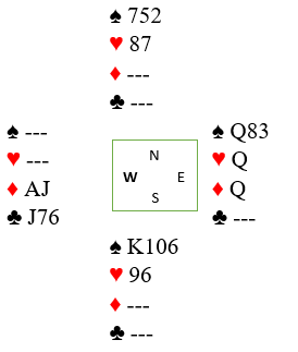 Spillefører stakk med esset og knekten kom på fra vest. Spillefører tok to store trumf, innkasserte tre runder kløver og spilte seg fri med ruter. Øst var inne og dette var igjen: