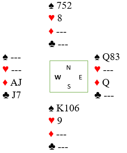 Dobbelfinessen behøvde imidlertid ikke å bli tatt også slik det ble spilt, for nå var øst inne. Spiller han liten spar kan den få rusle rundt til syveren. Spiller øst spar 8 stikkes med tieren, så hjerter over til nords åtter fulgt av nok en sparfinesse. Men da øst i diagramsituasjonen tok for hjerter dame gjorde spillefører en feil da han glemte å avblokkerte hjerter 9! Dermed så det slik ut:
