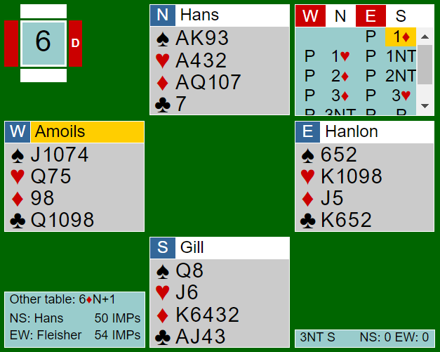 Det er ingen tapere i ruterkontrakt. En hjerter hos syd kan kastes i tredje runde spar. Men det er nok ingen god storeslem selv om det ikke er noen soleklar taper. Lilleslem er korrekt da det blir en god del arbeid for å få tak i tretten stikk. Tolv stikk går som regel greit med dette. Da FLEICHER sitt N/S-par meldte 6 ruter og vant tretten stikk ble det 10 IMP til dem siden Hans-Gill som du ser stoppet i 3NT.