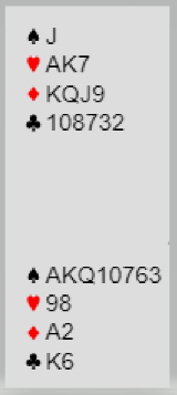 Men denne varianten hadde de ikke avtalt. Så syds 2 ruter var utgangskrav (XY), og 3 ruter var naturlig melding og viste 2-2-4-5, eller noen ganger 1-3-4-5 hvis hånden innebar et gjenmeldingsproblem som det absolutt var denne gangen. Da nord sa 3NT over syds 3 spar som viste minst sekskorts farge var det ikke lett å vite hva som er riktig med syds kort. Det kan stå slem, men det kan også være to hjertertapere fra start.