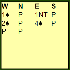 Ved det andre bordet hadde øst meldt kløver før de også havnet i 4 spar. For Bergen Akademiske spilte nord ut ruter 9. Det var ikke godt nok da hele spillet så slik ut: