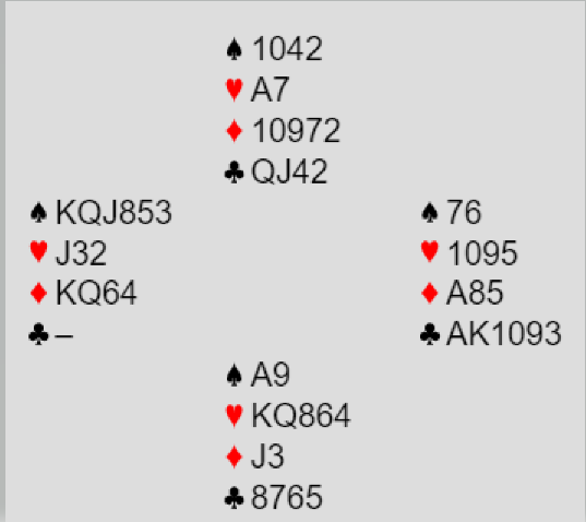 Nå står vel kontrakten og kvelden er reddet. Legger ned spar ess (nord ingen) og spiller kløver til kongen. Syd er squized, må holde en spar og kl Q blir blottlagt når jeg spiller kløver mot AJ.