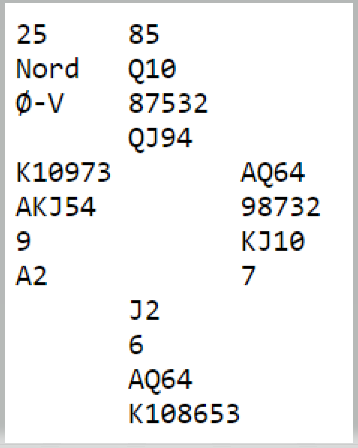 Om øst åpner blir det denne gangen enkelt for Ø/V, men de finner frem om øst passer og, i alle fall om ikke syd gjør noe i tredje hånd:
