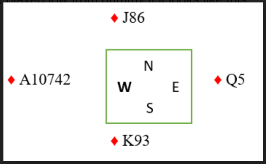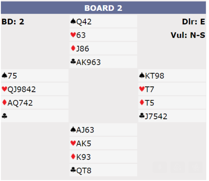 Problemet er selvsagt kun et problem om kløveren sitter skjevt. Det er ikke usannsynlig siden vest har vist mange kort i de røde fargene. Med kun tre kløverstikk behøves mer, og øst kan ikke slippes inn medmindre han har kun tre rutere (forsvaret får i så fall ett stikk i kløver og kun tre i ruter), eller ruter sitter 6-1 så øst ikke har flere ruter (mer usannsynlig). Men om ruter sitter 5-2 blir det raskt bet om øst får komme inn.