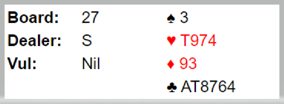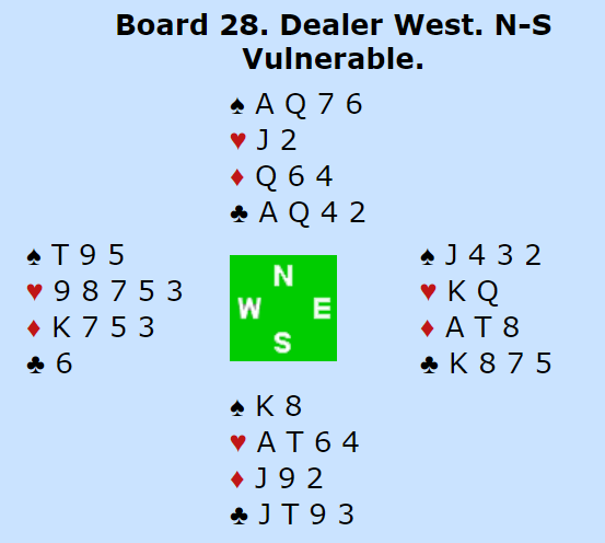Syd spilte etter disse meldingene spar ut mot 3NT, Som du ser er det elleve sikre stikk i sparkontrakt. Der tas simpelthen trumfen ut i tre runder så spilles hjerter med avkast for en ruter i fjerde hjerterrunde. N/S får kun to kløverstikk. Det eneste som kan true spilleførers overstikk i 4 spar er kløver konge i utspill, kløver til esset og mer kløver. Skjer det må spillefører gjette riktig å trumfe høyt, så sparhonnør fra øst og spar til finesse. Men det problmet fikk ingen, og alle som spilte sparkontrakt fikk elleve stikk.