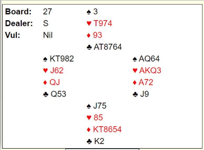 Hvordan det gikk? Jo, han slapp unna med tre doblete beter men det var delt topp med et annet par som var i samme kontrakt. May Liss i Vest hadde bare ru D singel og J107654 i kløver. Der var Syd renons siden Nord hadde kl K982 og kl K kunne stjeles god. I ruter var Nord renons og dermed viste det seg at storeslem i major bare var å brette ned! To par hadde faktisk meldt 6 hjerter.+3 til May Liss og Knut var de fornøyd med.