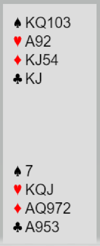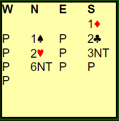 Vel, av og til står 6NT mens det er bet i trumfkontrakten. Men med en ni-korts trumftilpasning og dobbelton kløver på den ene siden (singel spar på den andre) er det ofte slik at det er lettere å få fatt i tolv stikk i trumfkontrakt enn i grand.
