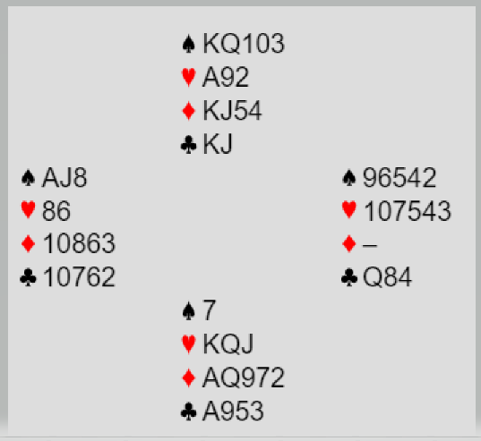 Det koker litt ned til hvilken finesse som bør prøves. Da spillefører altså ikke prøvde sparfinessen ble det bet da hele spillet så slik ut: