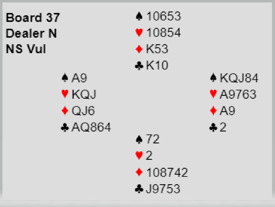 Grude (øst) var altså i 7 hjerter. Syd som skulle spille ut visste mye om Ø/V sine kort. Han spilte ut en liten kløver. Ved første øyekast – hvis en ser kun på Ø/V sine kort – ser det ut som det må gjettes om det skal tas kløver- eller ruterfinesse. Utspilleren (syd) var Andy Robson, en absolutt toppspiller og en skikkelig luring. Det er klart han kunne godt ha spilt ut unna kløver konge for å sette press på spillefører med det samme. Grude tok kløverfinessen, men da var det en bet i storeslemmen allerede etter første stikk.