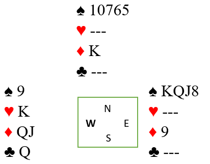 Hvis det er syd som har ruter konge og fem spar vil han kunne bli skviset i denne sluttpossen siden ruter ess ble tatt, hvis ikke blir øst skviset før syd. Det kan vel dessuten være en skvis i kløver/spar også, også da må ruter ess tas først.