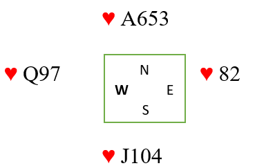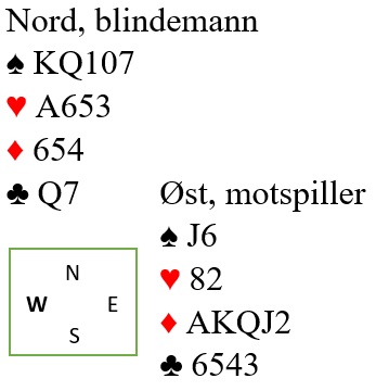 Hvis spillefører trumfer med fireren i fjerde ruterrunde setter vest i syveren som krever esset fra nord. Da vil vest ha igjen Q-9 bak KJ10 og det gir også vest sikkert trumfstikk (esset har jo blitt spilt).