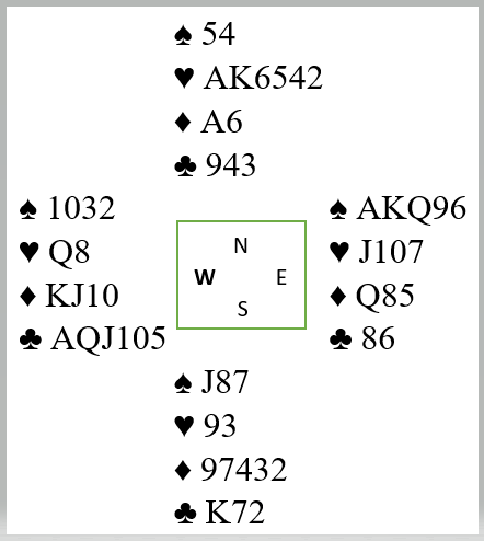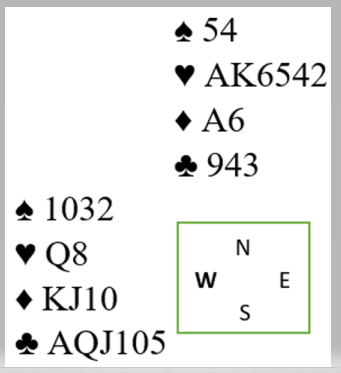 Øst har åpnet med 1 spar (minst femkort) og deretter vist minimum. Du (nord) har meldt inn 2 hjerter over vests 2 kløver-svar. Øst ble spillefører i 4 spar, og makker spiller ut hjeter 9. Du tar de to toppstikkene i hjerter. Øst følger først med syveren og så med hjerter knekt i andre stikk. Makker på syds plass følger med hjerter 3 andre gangen.