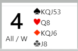 Om nord åpner med 1NT kan neppe syd kritiseres for å si 3NT direkte med denne fordelingen, selv om de kanskje har system til å finne 5-3 tilpasning. Det er ikke med helt trillrund hånd man bruker varianter for å finne trumfkontrakt etter makkerens grandåpning.