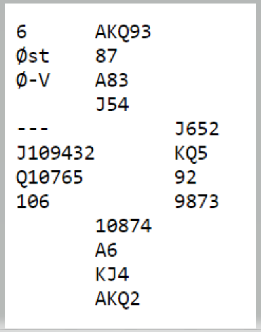 Ved det andre bordet var Rubbestadnesets N/S også i 6 hjerter og fikk ruter ut. Der ble det spilt hjerter til esset og hjerter til kongen for så å ta kløverstikk med avkast av ruter og spar fra syd. Men da ble det en bet siden hele spillet så slik ut:
