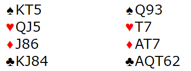 Og joda, Aa-Livgård var i 3 hjerter som N/S, men kontrakten ved det andre bordet var ikke så opplagt. Slik så hele spillet ut: