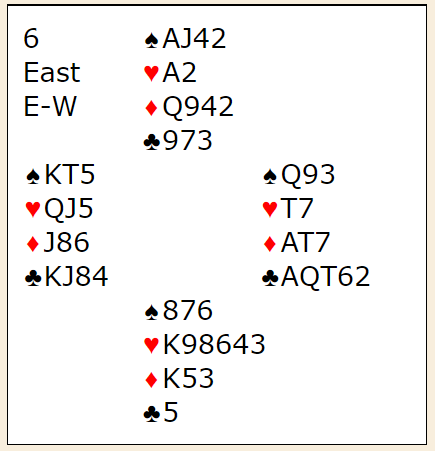 Normalt vil en slik 3NT gå bet med kun en hjerterstopper, for N/S godspiller hjerteren og spillefører har kun syv toppstikk i kløver og hjerter samt ruter ess. Han må innom motparten. Så med hjerter 5-3 kunne de ha sørget for å ha overgang til syd i den fargen, og om syd har spar ess er det håpløst, syd kommer inn til hjerterstikkene sine. Men her satt hjerteren 6-2, og syd hadde ikke noe hurtig inntak. Det er faktisk slik at om spillefører gjetter sparen (knektens plassering) så kan ikke 3NT rokkes!