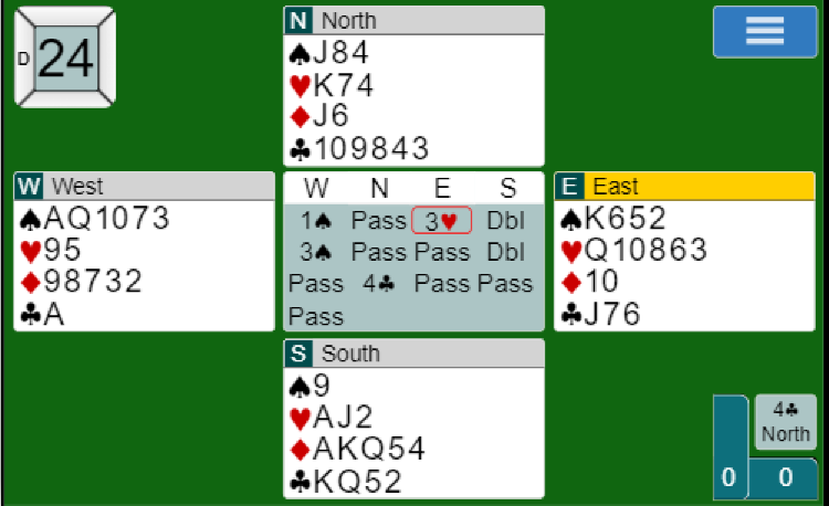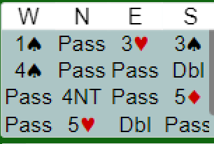 Øst sin 3 hjerter var kunstig og viste sparstøtte. Det som deretter foregikk er det vanskelig å forstå. Men de profilerte spillerne Nowosadzki – Zimmermann endte i alle fall i 5 hjerter doblet på 3-3 tilpasning!